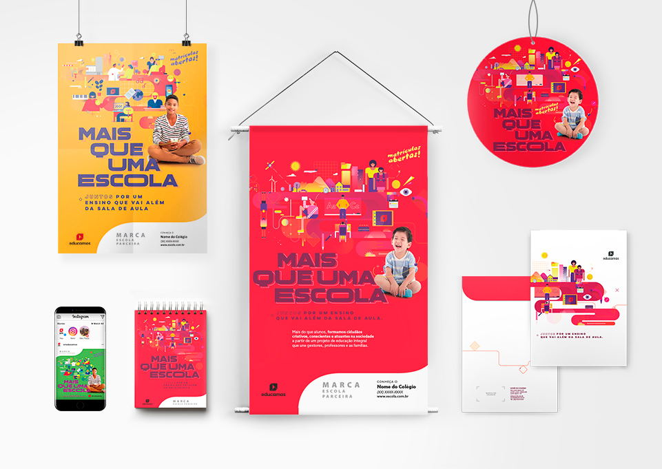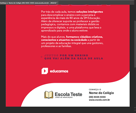 Para que cada peça seja personalizada de acordo com os temas de sua escola, a edição dos arquivos deve ser feita por um designer ou alguém que tenha conhecimentos básicos nos softwares Photoshop, Illustrator e Indesign.