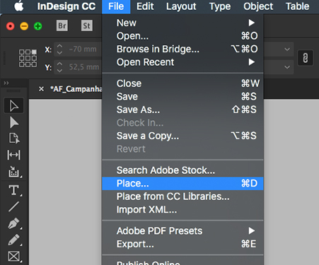Clique no menu FILE/ARQUIVO e em seguida na opção PLACE/INSERIR.