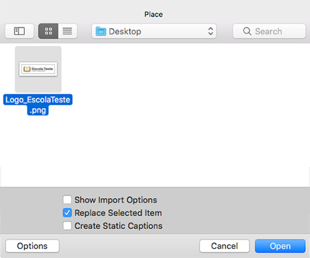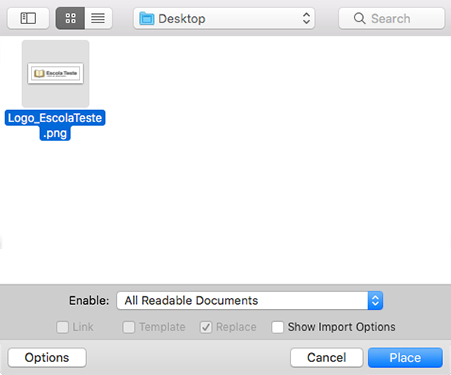 Uma janela irá se abrir. Selecione o arquivo do logo (dê preferência por arquivos nos formatos JPG com fundo branco ou PNG com fundo transparente. Além disso a imagem deve estar em boa resolução), e clique em PLACE/INSERIR.