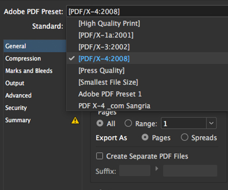 Clique na caixa ADOBE PDF PRESET e selecione a opção [PDF/X-4:2008]. Clique em SAVE PDF para finalizar.
