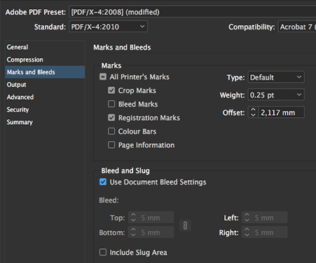 Na seção MARKS AND BLEEDS/MARCAS E SANGRIAS deixe marcado as opções como na imagem acima. Clique em EXPORT para finalizar.