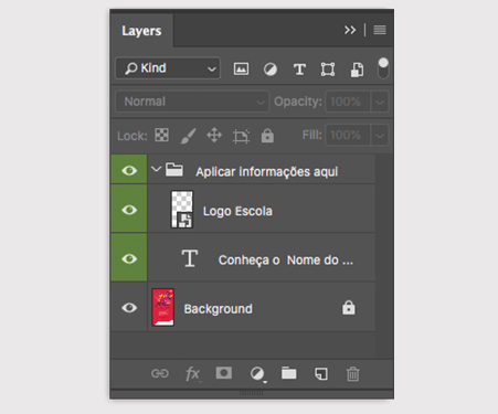 Ao abrir o arquivo, vá até o painel LAYER/CAMADA (Caso esteja desabilitado, clique em WINDOW/JANELA e selecione LAYER/CAMADA), e selecione a layer APLICAR INFORMAÇÕES AQUI;