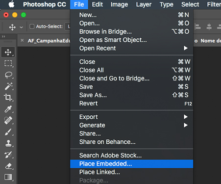Clique no menu FILE/ARQUIVO e em seguida na opção PLACE EMBEDDED/INSERIR INCORPORADO.