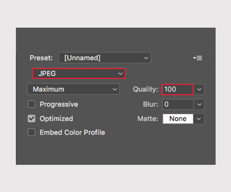 Uma janela irá se abrir. Na seção PRESET, selecione a opção JPEG e deixe a QUALIDADE em 100;