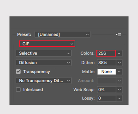 Na aba PRESET, selecione a opção GIF e deixe a COLORS em 256;