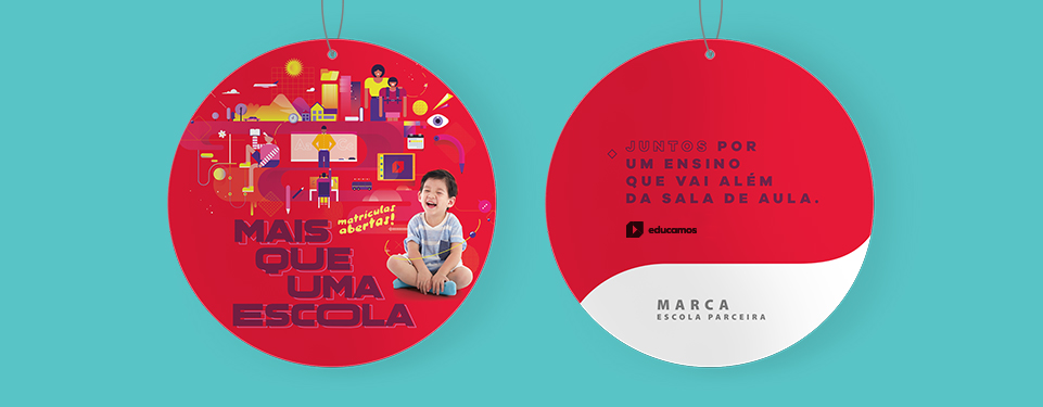 O móbile chama a atenção e ajuda a compor a identidade da campanha no ambiente. Pode ser aplicado no teto da recepção ou em áreas de grande circulação das escolas. Para que tenha uma boa visibilidade, o ideal é que não fique tão baixo que possa atrapalhar a livre circulação de pessoas, nem tão alto que impossibilite a visualização da peça.